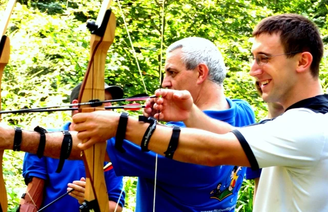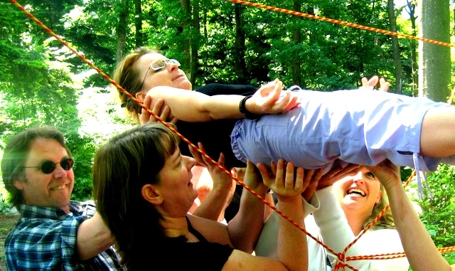 In a 3-hour team training, the team tasks can include ground elements (spider web, trust fall, balancing in the low ropes course, etc.) and, if desired, be supplemented with high elements (sky ladder, pamper pole, chimes) or intuitive archery.