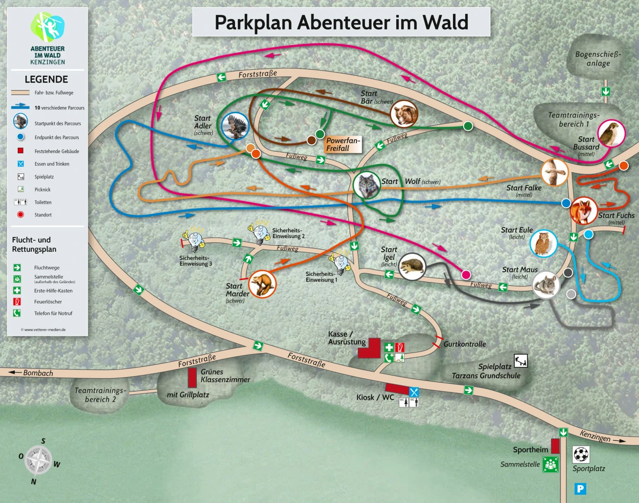Viele Parcours und abenteuerliche Brücken, Übergänge, Tarzansprünge, Freier Fall aus 12,5 m, Kletternetze...